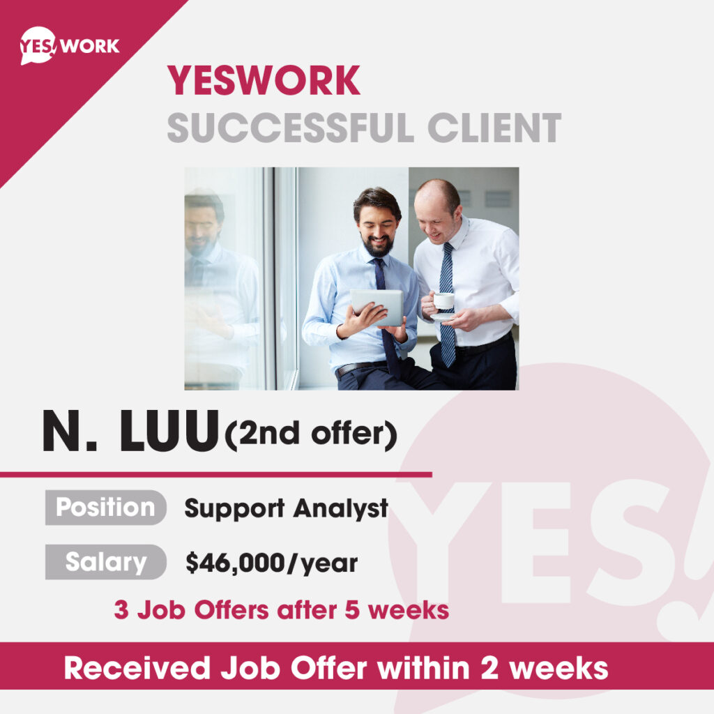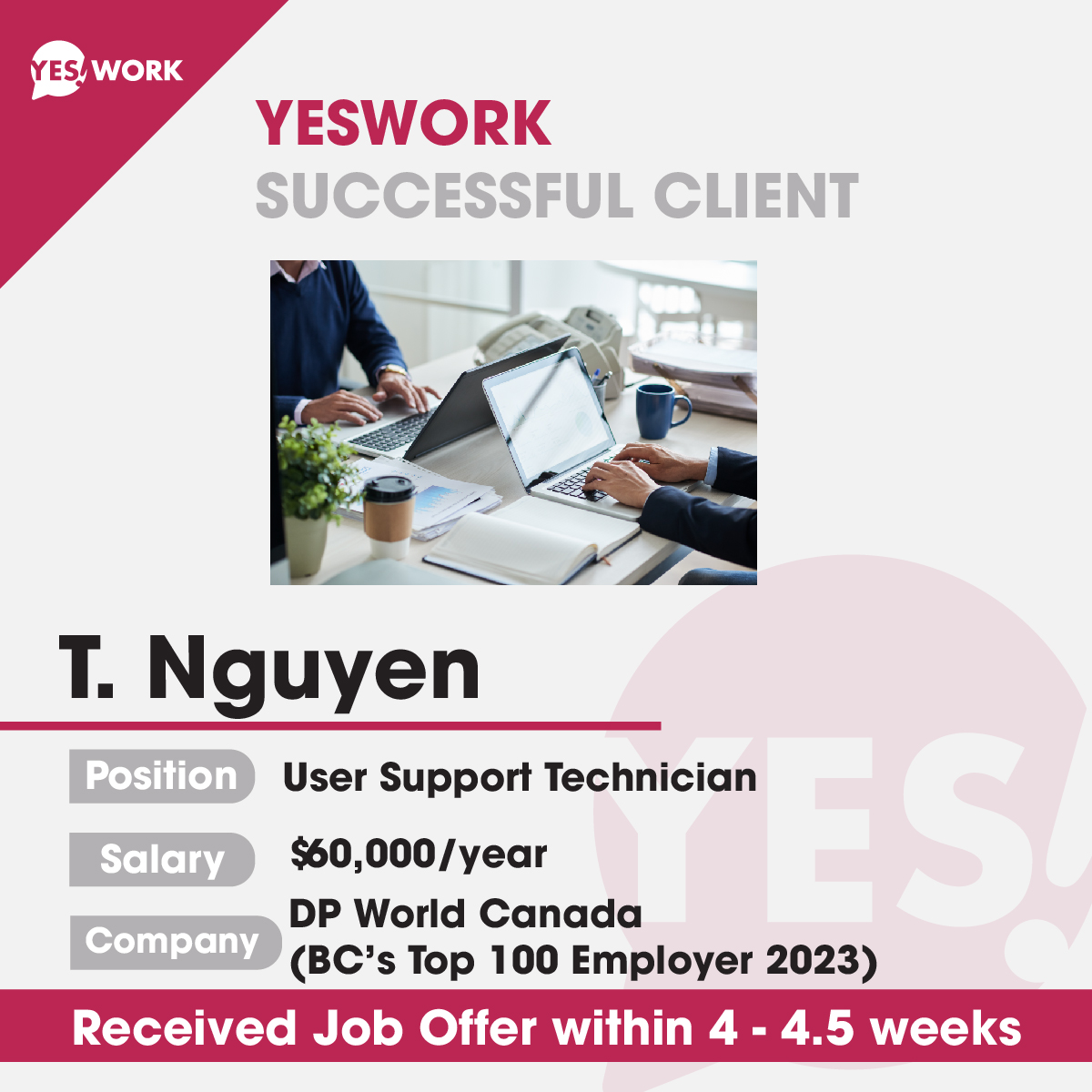 T.Nguyen has received a job offer for the User Support Technician position at DP World Canada, which is recognized as one of BC’s Top 100 employers in 2023. The offered salary is $60,000 per year. YesWork is extremely proud of this success.